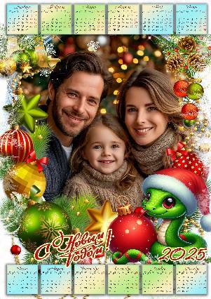 Календарь на 2025 год символом года змеей и новогодними шарами