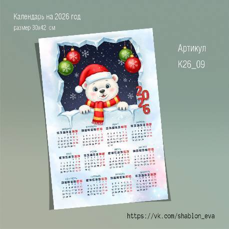 Шаблон новогоднего календаря на 2026 год с медвежонком