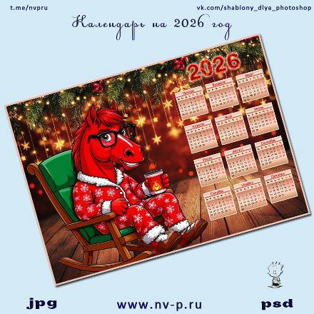 Новогодний календарь на 2026 год с символом года - Красная огненная Лошадь.