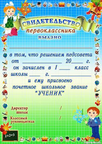 Детские грамоты - Свидетельство первоклассника о присвоении звания "ученик"