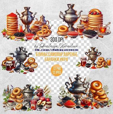 Клипарт - Блины, самовар, варенье,баранки,икра