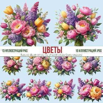 Клипарт - букеты из тюльпанов, пионов и сирени