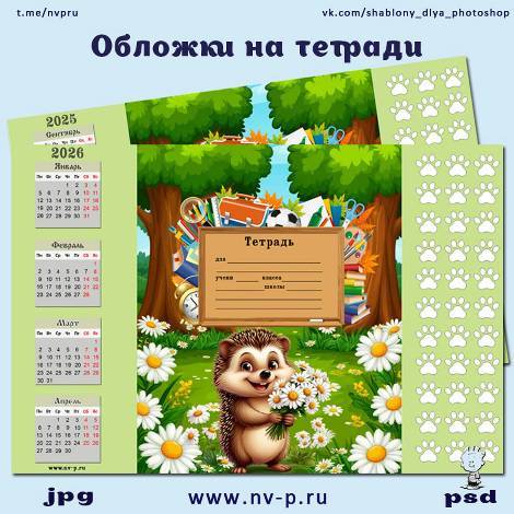 Обложки на тетради с Ёжиком + календари на 2025-2026 года