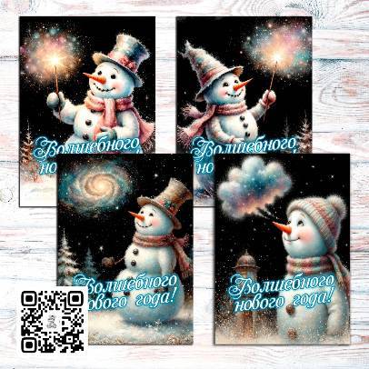 Шаблоны новогодних, волшебных открыток с чудесным снеговиком